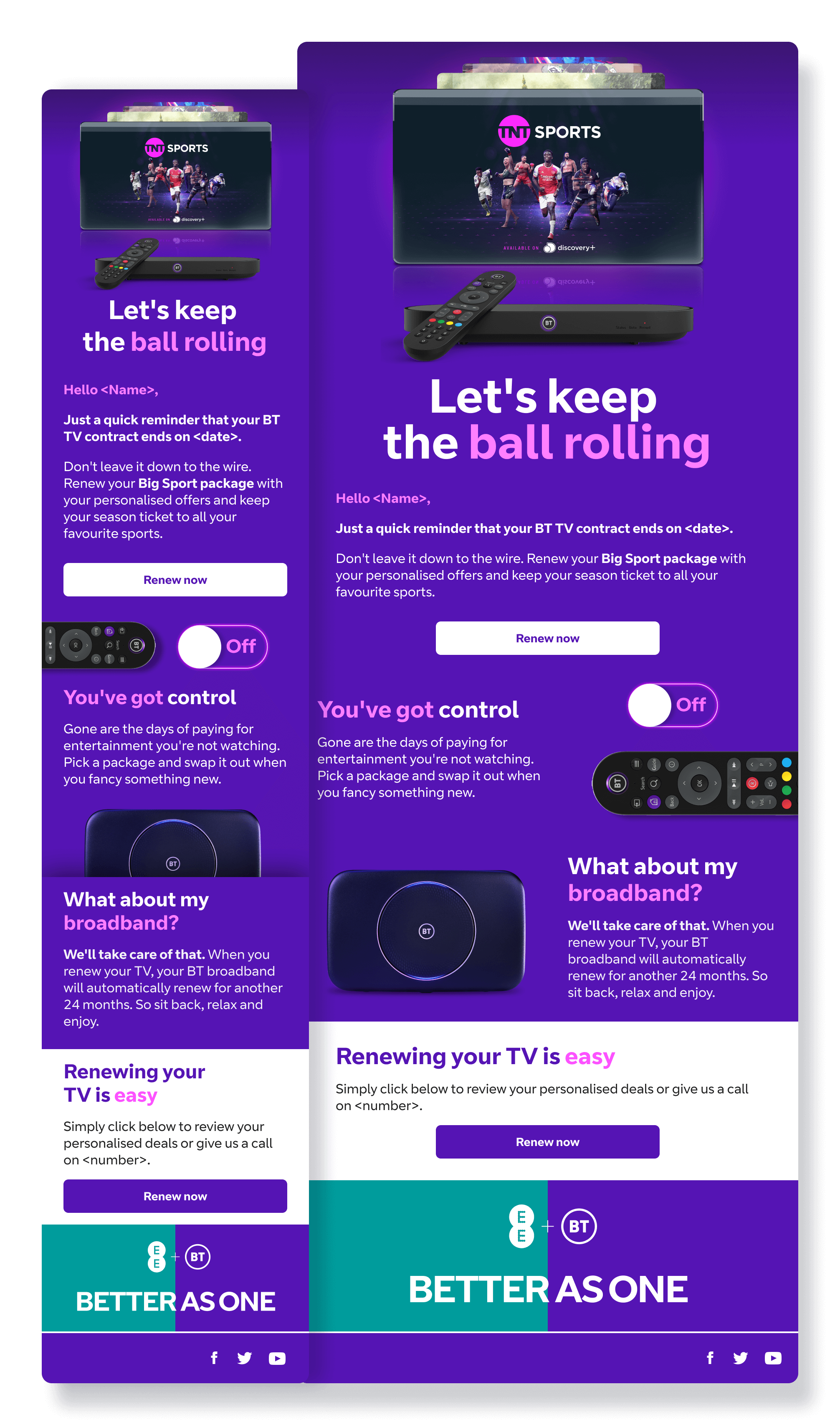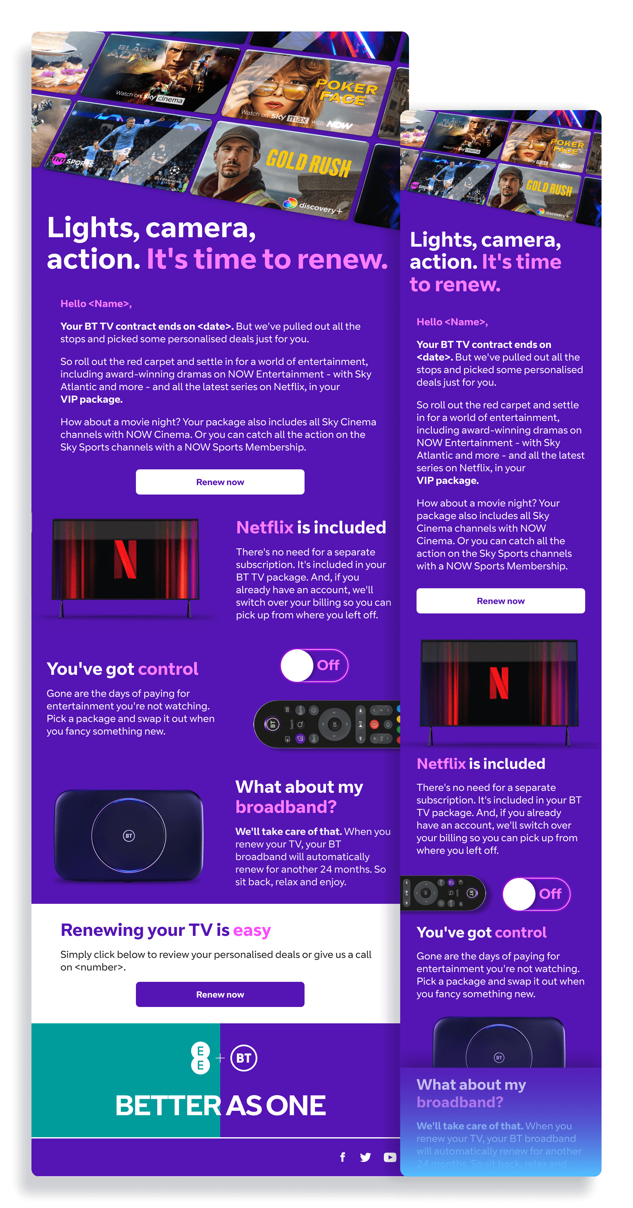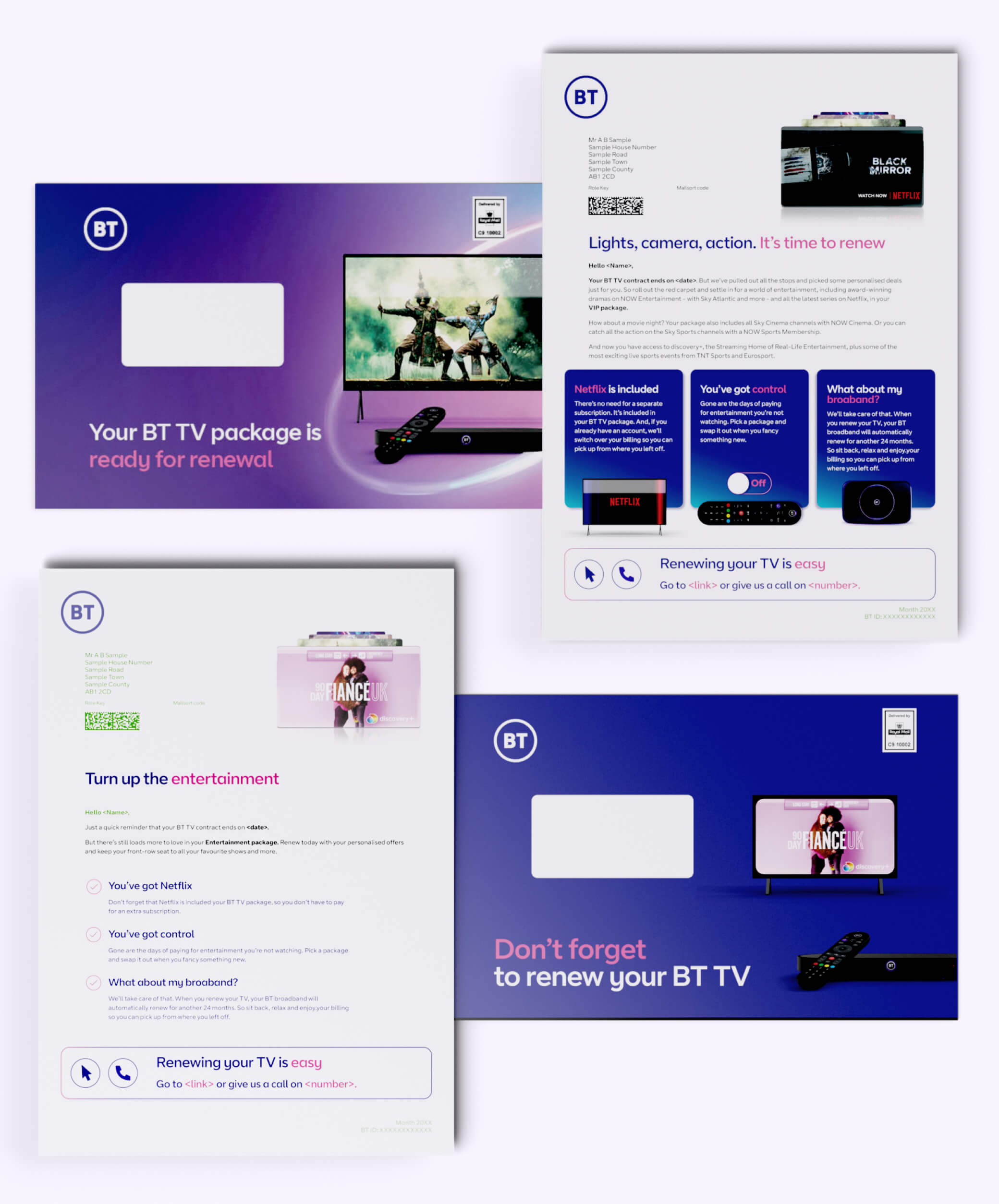 To encourage customers to recontract their TV packages, I designed a multi-channel, two-touchpoint campaign using personalised email and direct mail. Each communication highlighted the value of upgrading with a bold and fresh design. The campaign featured various package options, from Essential to VIP, showcasing partnership content that enhanced customer value across tiers.