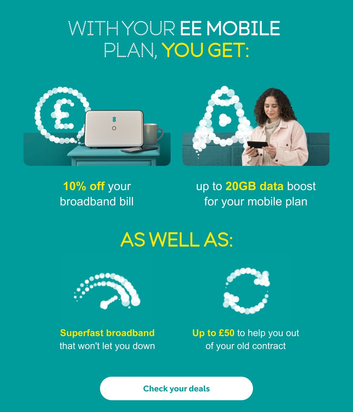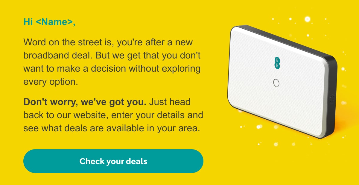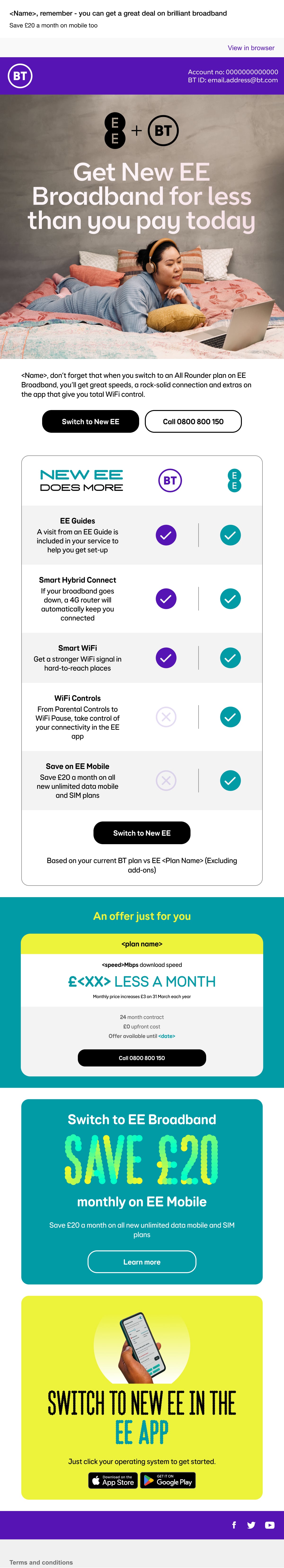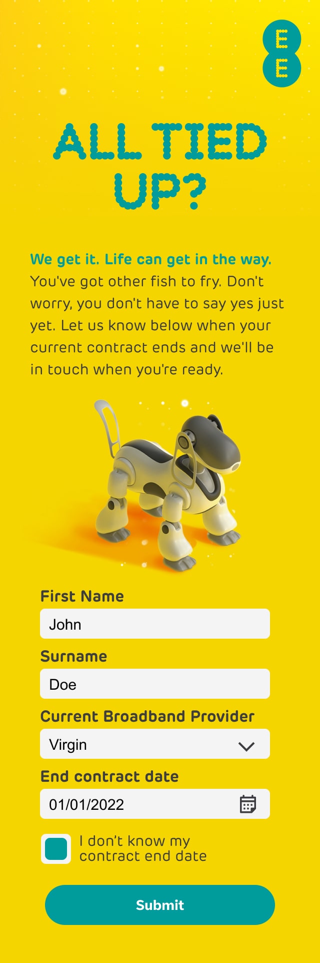 A campaign featuring an email and landing page that encourages potential customers to share their contract details if they aren’t ready to switch, capturing future leads. It highlights the benefits of EE Broadband, includes clear CTAs, and ensures advisors can follow up with personalised offers when the time is right for the customer.