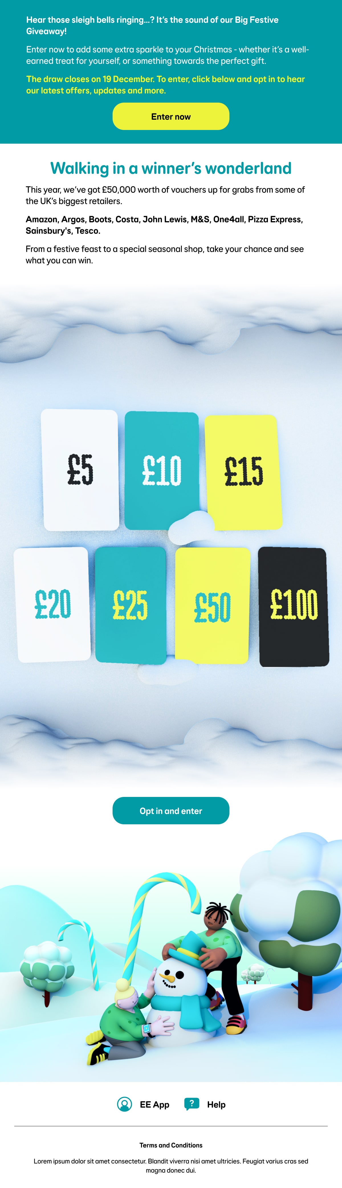 A collection of creative campaigns I produced, spanning MMS, email, landing pages, and rich media. From showcasing the benefits of EE services to highlighting exclusive offers, each piece delivers tailored messaging, vibrant visuals, and clear calls-to-action, designed to enhance customer experience and drive action across digital channels.
