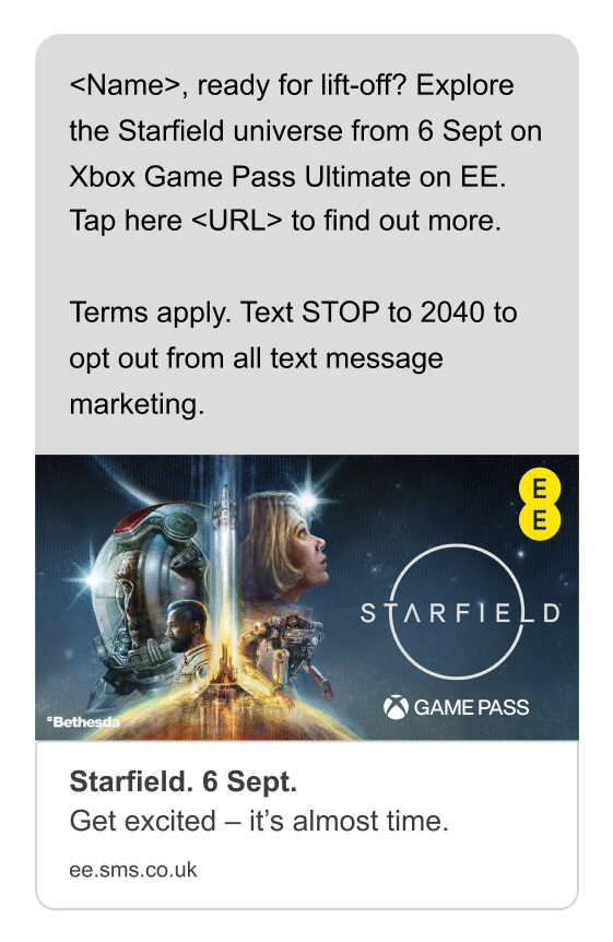 A rich media campaign hosted on the Sinch platform, showcasing the launch of Starfield alongside other Xbox Game Pass titles and EE’s ultrafast broadband plans. I created a cohesive and engaging user experience by designing the landing page, editing the promotional video, and producing all campaign visuals.