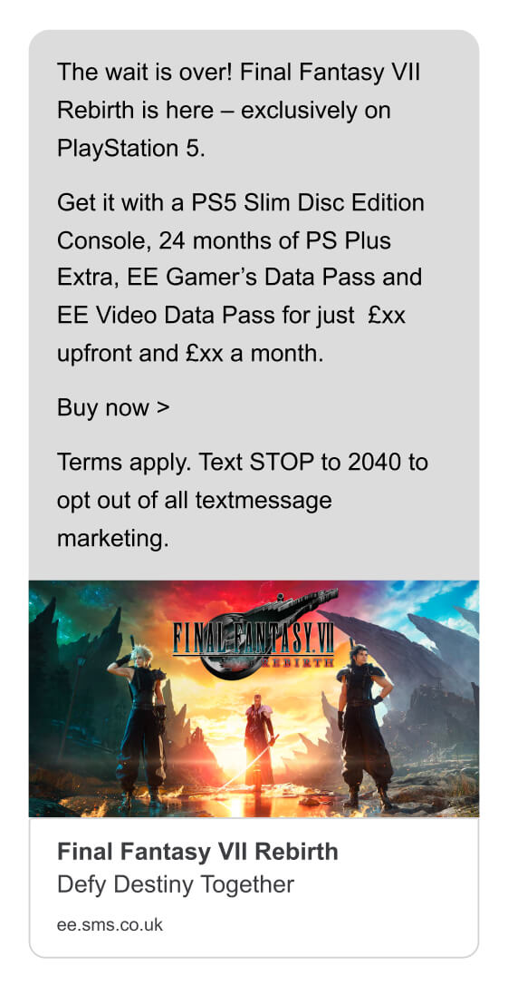 Another rich media campaign, promoting the highly anticipated launch of Final Fantasy VII Rebirth exclusively on PlayStation 5. The campaign highlighted a PS5 Console bundle for EE customers. I designed the visuals, created the MMS, animated the engaging promotional video, and developed the landing page.