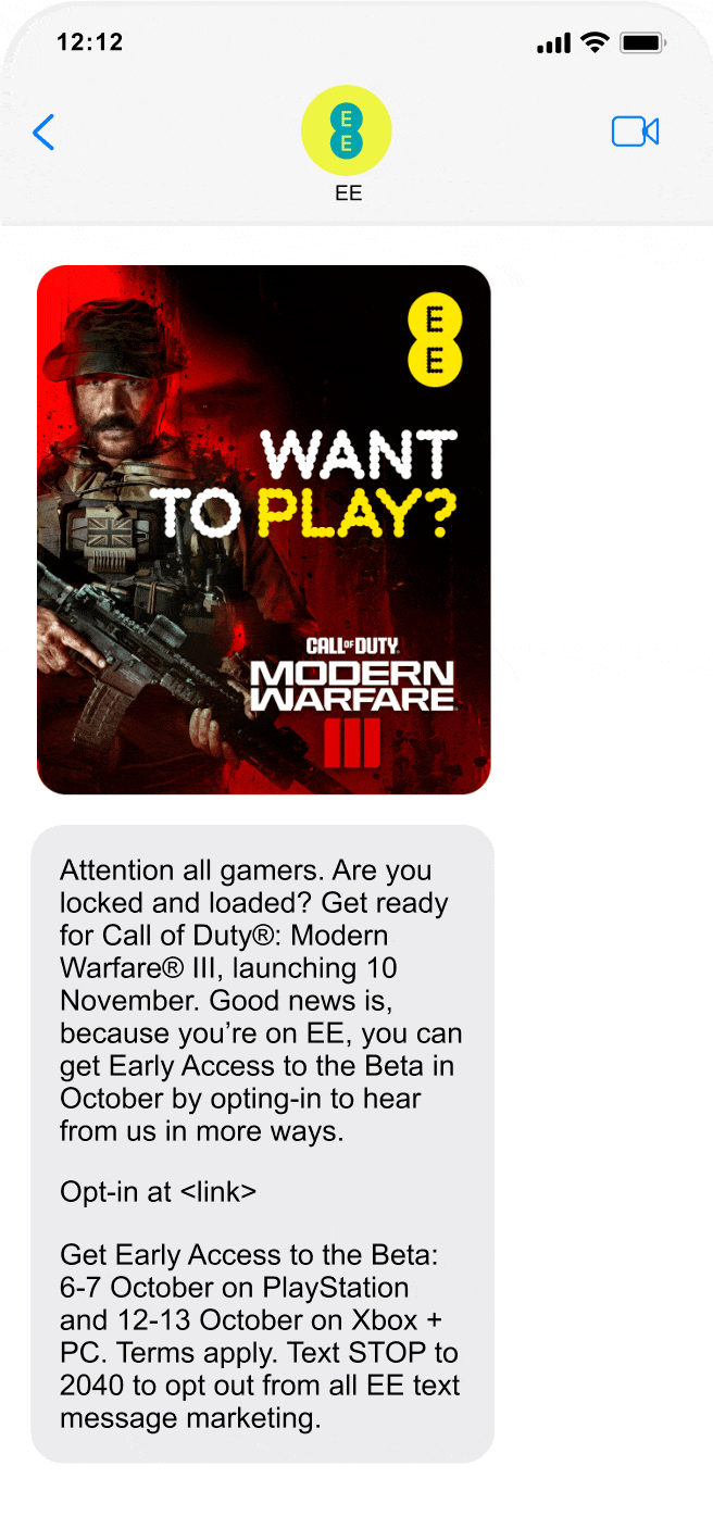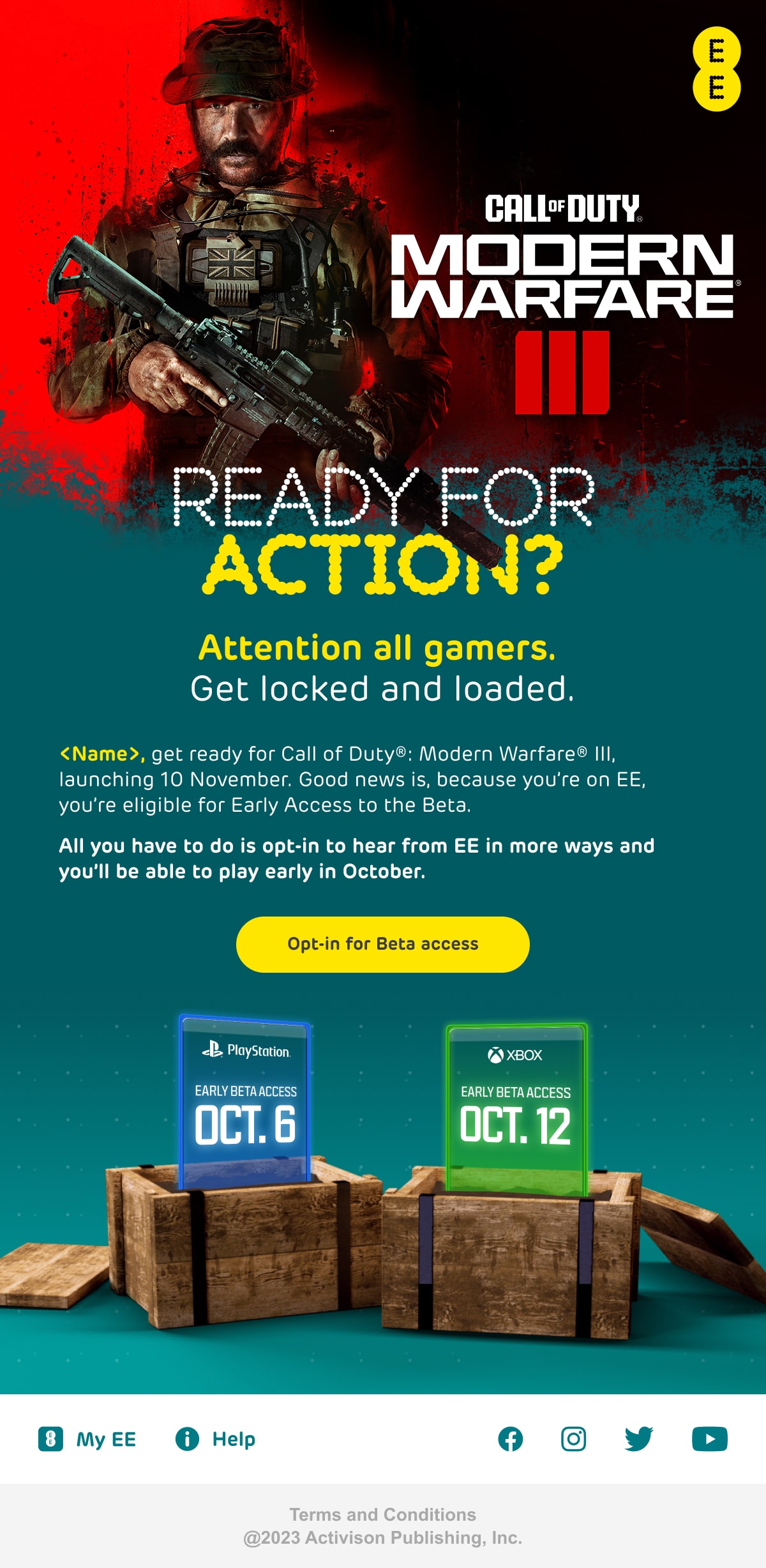 An MMS and email campaign in partnership with Activision to engage EE gamers ahead of the game launch. Featuring striking visuals and action-driven messaging, it encouraged opt-ins for exclusive benefits and achieved strong engagement, reinforcing EE's connection to gaming audiences.
